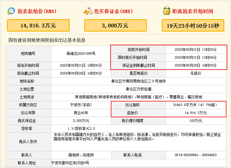 出让面积31863m²(折合47.794亩),1.3<容积率≤3.0,建筑密度≤50%,绿地率≥20%,限高120m。 拍卖起始价14816.3万元,竞买保证金3000万元,土地用途为其他商服(医疗)、零售商业、餐饮用地。